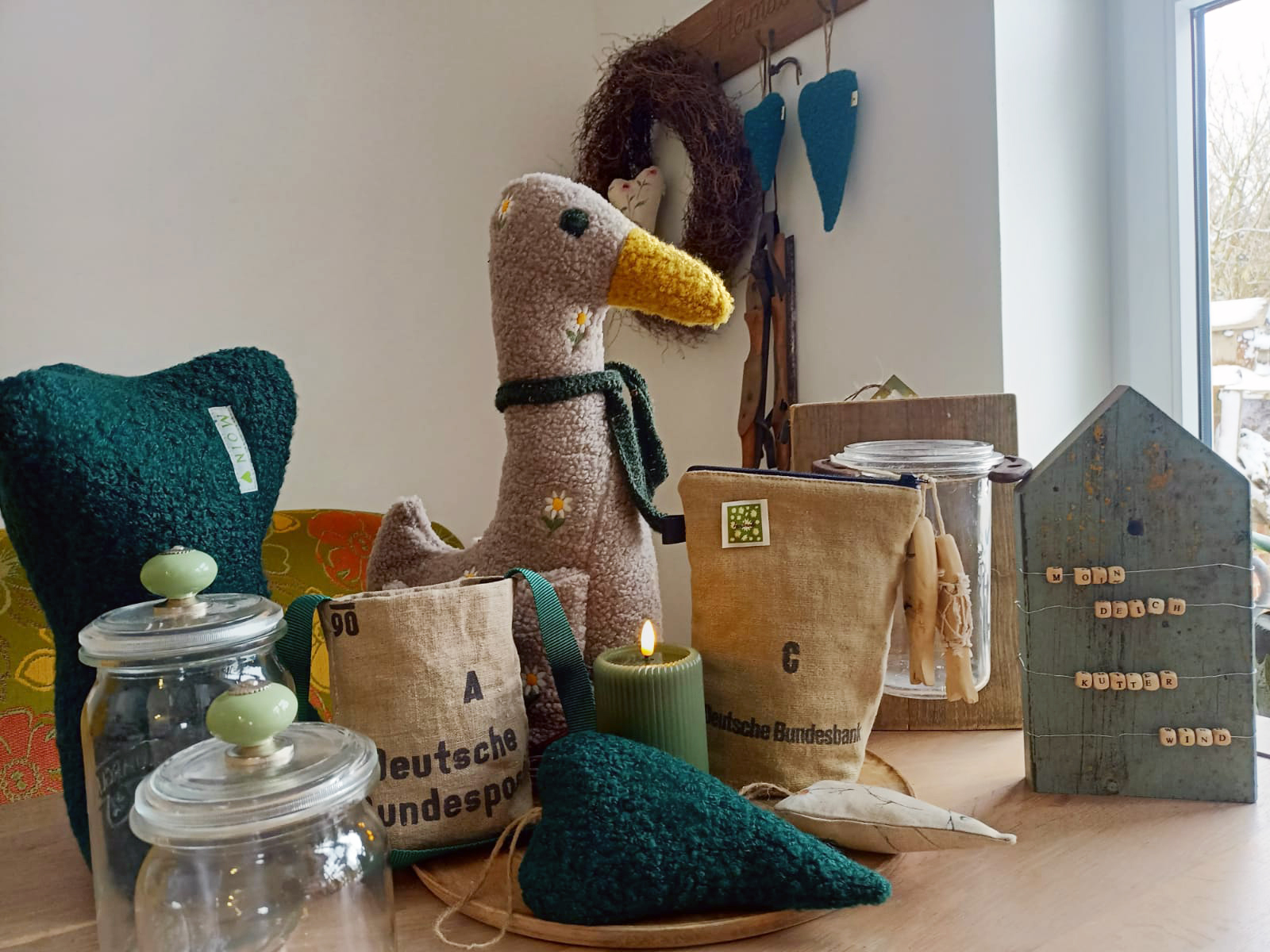 Wir bieten geschweißte Dekoartikel für den Garten aus Hufeisen an (z.B. Windlichter, Gartenstecker, usw). Wir bieten auch selbstgenähte Unikate an. Aus alten Geldbeutel der Bundesbank nähen wir Taschen und Schlüsselanhänger. Leseknochen und Körnerkissen (Bio-Körner) gehören auch zu unserem Angebot.